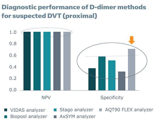 El test de Dímero-D del AQT90 FLEX demuestra un alto valor predictivo negativo (NPV), comparable con los valores del mejor de sus competidores, lo que significa menor riesgo de enviar a casa a pacientes enfermos sin ser tratados. El test demuestra también una especificidad muy elevada (un número bajo de falsos positivos), lo que significa menos pruebas innecesarias y costosas en pacientes sin ETV.